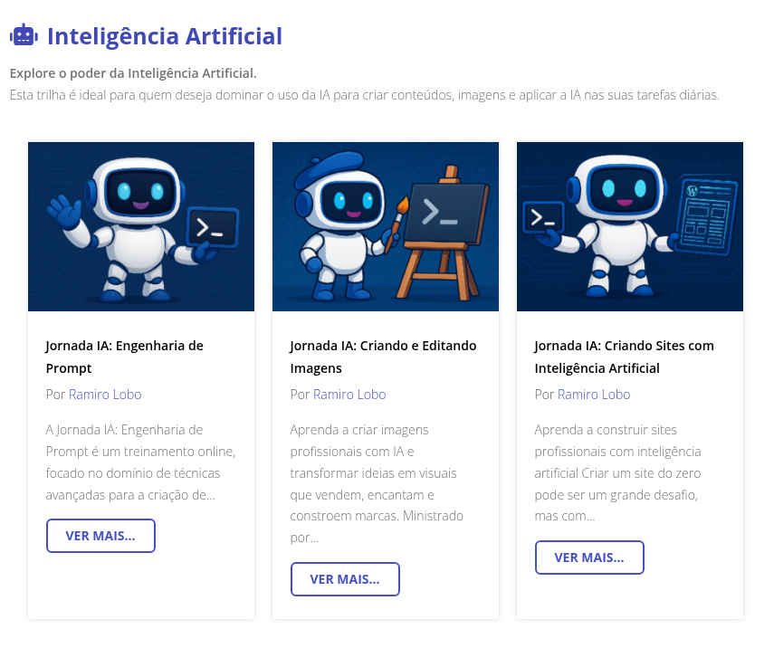 Na Academia temos ainda muitos cursos focados no uso de Wordpress, como o curso de Elementor Pro, Beaver Builder, Gutenberg (haverá uma nova versão atualziada em breve) e os novos cursos de Criação Rápida de Sites tanto com Elementor quanto com Gutenberg que faz uso do Starter Templates mas não com uso de IA. Nesses cursos você aprende a escolher modelos prontos, instalar e fazer a edição, mas a parte de conteúdo deve ser feita por você mesmo e pode ser usando IA.